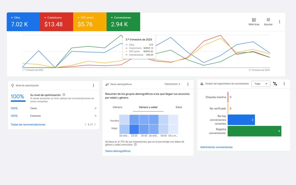 La cuenta se estructuró con palabras clave segmentadas, grupos de anuncios por caso de uso, extensiones de llamada y señales de ubicación. Mediante pruebas A/B continuas, palabras clave negativas y ajustes de puja por dispositivo y hora, las campañas aumentaron las llamadas calificadas y los leads generados por formulario, manteniendo un coste por conversión competitivo y una alta puntuación de optimización.